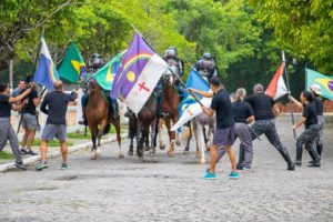 Na última quinta-feira (13), alunos do Curso de Policiamento Montado (CPMon/2020) concluíram a Disciplina de Choque Montado com a passagem pela pista de Ações de Choque, onde os conjuntos, cavalos e cavaleiros, são testados em diversas situações reais. O conjunto é submetido, ao longo do percurso, a dificuldades como sirenes, fogos, bandeiras, jatos d’água, fumaça, gás lacrimogêneo, arremesso de objetos por manifestantes, granadas de efeito moral e fumígena, além de transposição de obstáculos rústicos e em chamas.