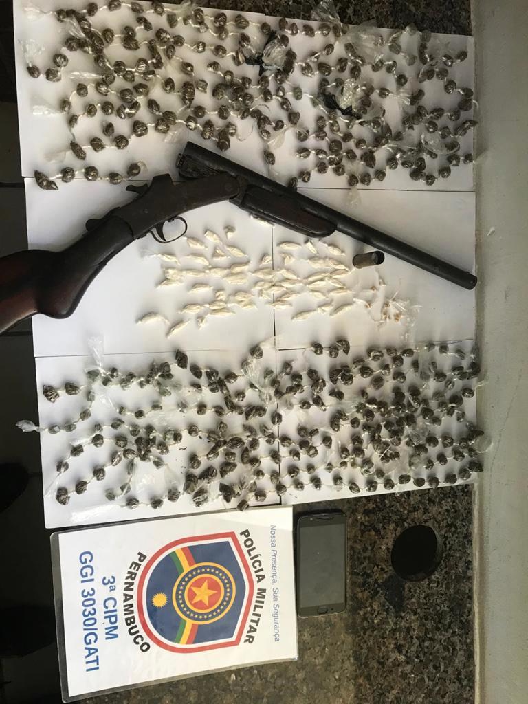 O efetivo foi informado sobre o comércio ilegal, seguiu para o local indicado e realizou uma abordagem no homem apontado como responsável pelas vendas. Com ele, foram encontrados 406 big bigs de maconha, 48 pinos de cocaína, dez pedras de crack e ainda uma espingarda calibre 20, com numeração suprimida.