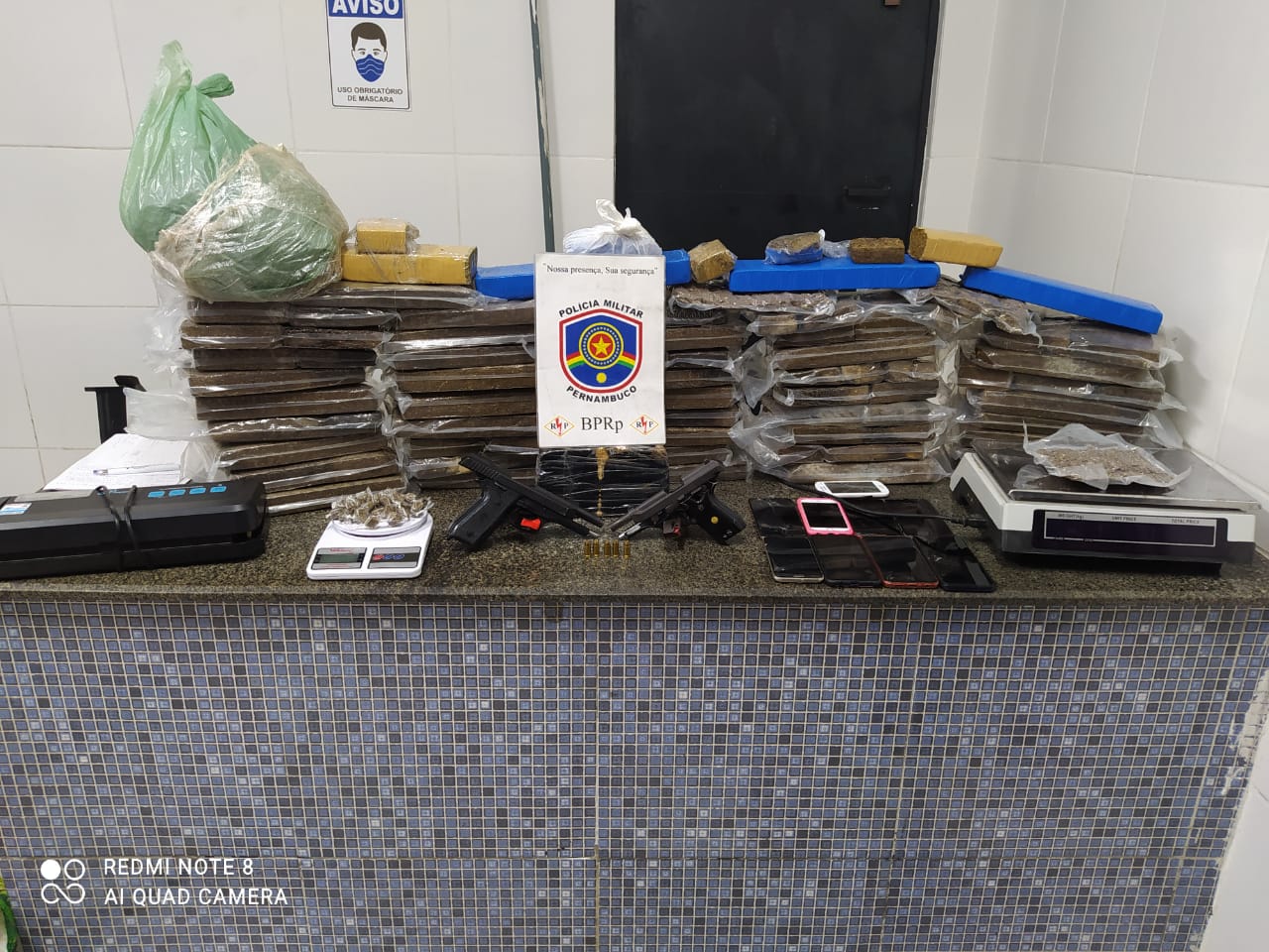 Em ato contínuo, as equipes seguiram para um domicílio no bairro do Timbi, no município de Camaragibe, onde no local uma mulher foi detida, sendo apreendidos mais 03 kg maconha, 01 kg de crack, duas pistolas, uma calibre 380 e outra calibre .40, (ambas com numeração suprimida), cinco munições de cal.380 intactas e uma balança de precisão. Na residência estavam presentes mais quatro suspeitos, que também foram presos.