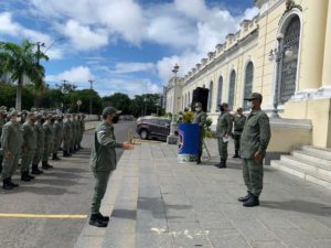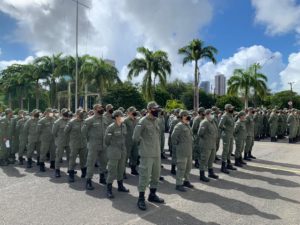Finalizando, a tropa, acompanhada pela Banda de música da PMPE, entoou a Canção da Polícia Militar de Pernambuco, o hino da Corporação.