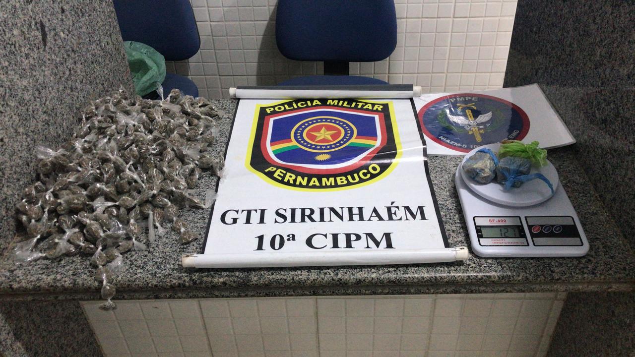 Policiais militares da 10ª CIPM apreenderam dois adolescentes e prenderam um adulto, nesta quarta-feira (24/05), no bairro Vila Nova, em Sirinhaém. O efetivo fazia rondas na localidade quando avistou o trio em frente a uma casa, conhecida por denúncias anteriores sobre venda e consumo de drogas. Ao realizar abordagem no grupo, foram encontrados com um deles, de 17 anos, 90 big bigs de maconha.