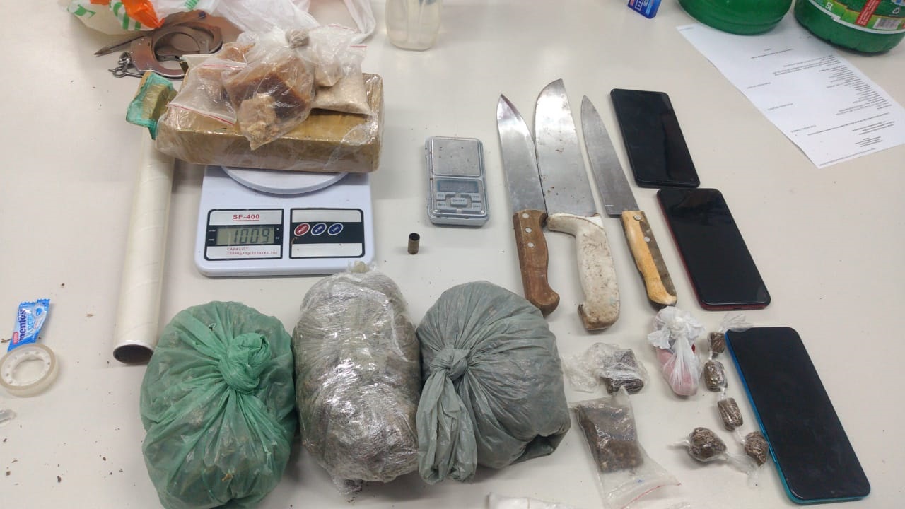 A respeito do tráfico, o envolvido alegou ter em sua casa apenas 100g para consumo. No entanto, o policiamento encontrou no local 1kg de crack e 280g e outros 21 big bigs de maconha. Ele e a esposa foram detidos e apresentados na Delegacia de Prazeres, que vai também investigar sua participação em um bárbaro homicídio, no qual uma mulher foi morta e teve o corpo carbonizado por causa de uma dívida de drogas.