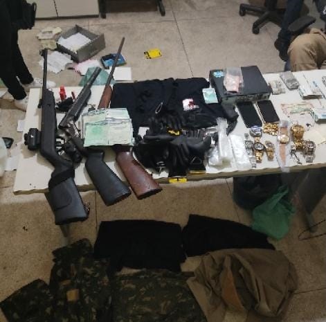 Incursões foram realizadas, porém, não se logrou êxito na captura do homem. Durante as buscas no interior da casa foram encontrados uma espingarda calibre 12, uma espingarda de fabricação artesanal sem número e marca, uma espingarda calibre 36 , além de uma espingarda de pressão, duas munições calibre 12 e vários objetos como balança de precisão com resíduos de pó branco e várias embalagens de pequenos sacos plásticos, caixa de munição de espingarda de pressão, várias balaclavas, luvas, diversos relógios, corrente dourada, aproximadamente R$ 9.000 (nove mil reais) e U$ 112 (cento e doze dólares), dois aparelhos celulares, dois veículos, algumas vestes militares e camufladas, um aparelho HD para câmeras, um cabo de coronha para revólver.