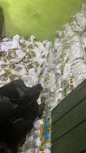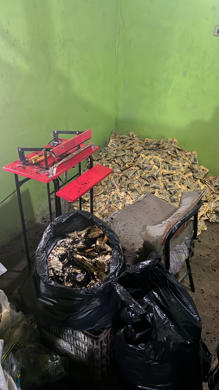 Foi feito o deslocamento até o local, com a impressão de que estaria ocorrendo tráfico de drogas, mas na realidade foi constatado que se tratava da fábrica, onde eram falsificadas marcas como Maratá, Super Bom, Saci, Suave e Rocha. Quatro pessoas estavam no local e foram presas embalando o material fabricado.