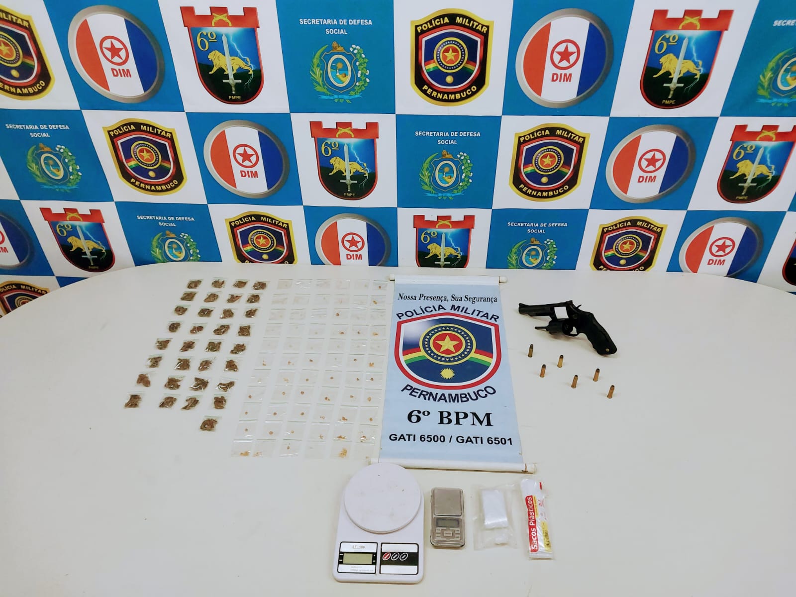 Ao chegar no ponto indicado, o efetivo observou um grupo fugindo em direção a um charco e alcançou um dos suspeitos. Durante busca pessoal, foram encontrados com ele um revólver calibre .38 com seis munições, 32 ziplocks de maconha, 66 pedras de crack e duas balanças de precisão.