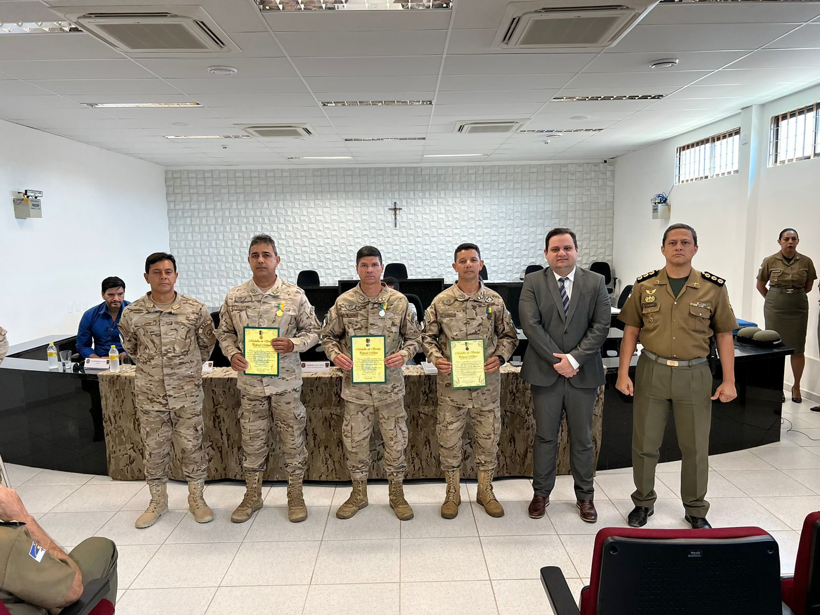 Os eventos reuniram policiais militares do BEPI e autoridades locais, homenageando veteranos e premiando os PMs da ativa com a entrega de Medalha do Tempo de Serviço Policial Militar.