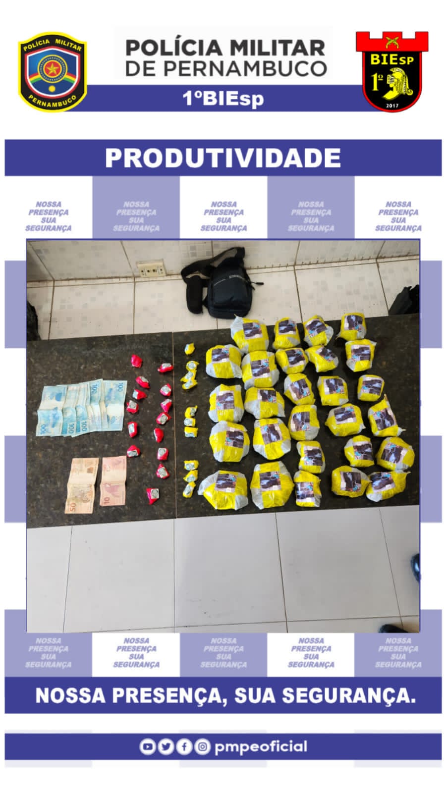 Uma mulher foi presa, segunda-feira(2), por policiais do 1º BIEsp, em Caruaru. O efetivo recebeu informações sobre tráfico no Parque 18 de Maio e, ao abordar a suspeita, ela ficou muito nervosa e acabou revelando que uma pessoa pediu que ela guardasse uma sacola e somente depois tomou conhecimento de que se tratava de entorpecentes. Ela mostrou o local onde deixou o material e lá foram localizados aproximadamente 900g de maconha, 70g de cocaína, 60g de crack e R$ 760,00 em espécie. Diante dos fatos, a envolvida foi apresentada na Delegacia de Plantão para adoção das medidas cabíveis.