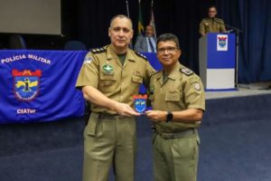 Durante a cerimônia, os idealizadores do curso, coronel RRPM Antônio Menezes, o comandante do Centro de Formação e Aperfeiçoamento de Praças (CFAP), tenente coronel Kleber Noberto, e a tenente coronel Aline Lopes,
