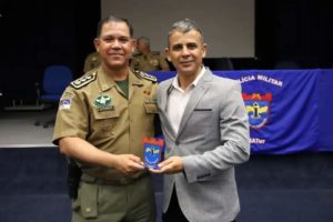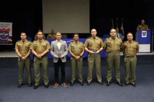 Durante a cerimônia, os idealizadores do curso, coronel RRPM Antônio Menezes, o comandante do Centro de Formação e Aperfeiçoamento de Praças (CFAP), tenente coronel Kleber Noberto, e a tenente coronel Aline Lopes,