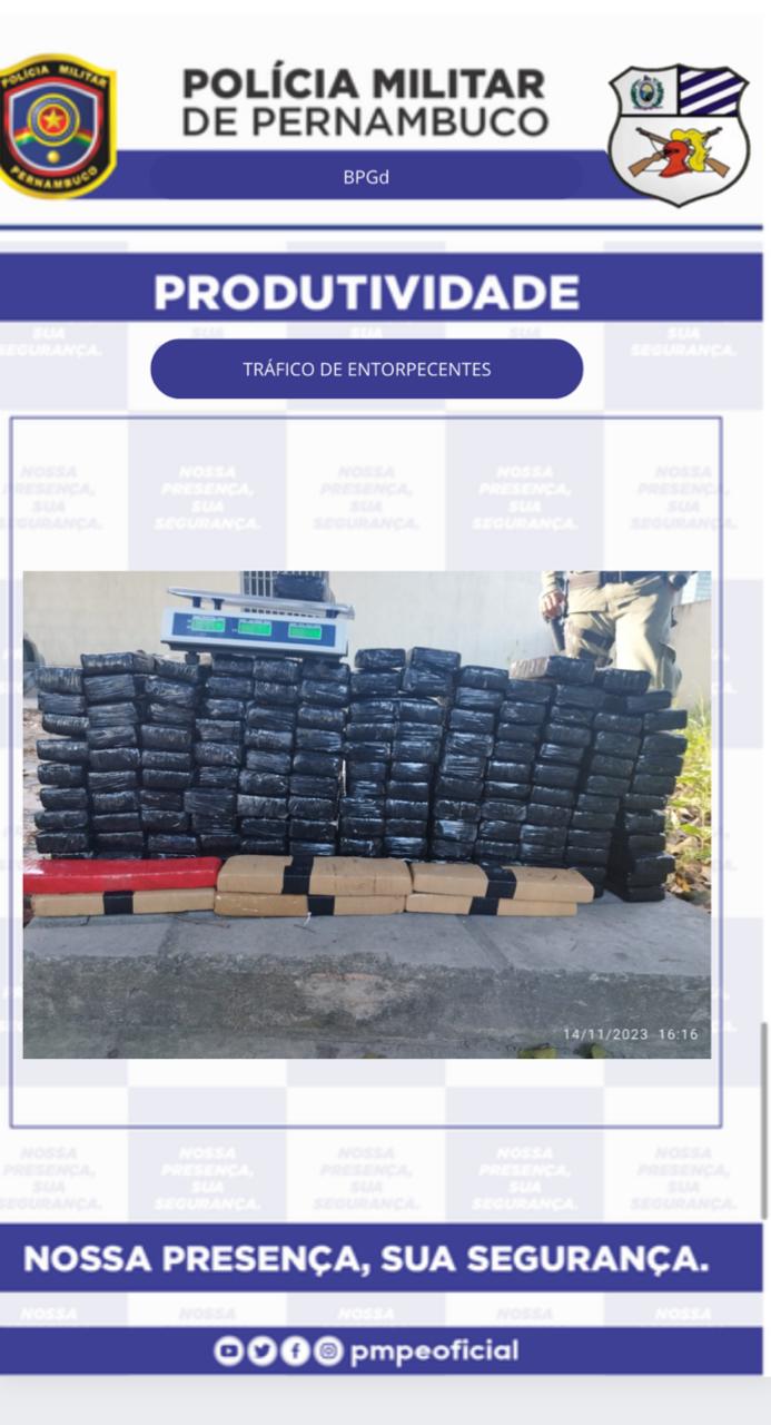 Já durante a tarde, em mais uma ação eficaz da PM, uma operação conjunta entre a equipe do Capturas e GER do BPGd resultou na prisão de um suspeito no bairro de Piedade, acompanhada da apreensão de aproximadamente 97 kg de uma substância análoga à maconha, além de uma balança de precisão. A ocorrência está sendo formalmente apresentada na Delegacia de Prazeres.