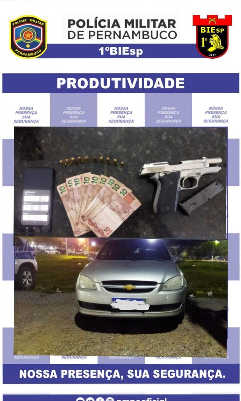 Policiais do 1º BIEsp recuperaram um veículo roubado e prenderam dois suspeitos que haviam cometido o crime um pouco antes, em Caruaru. Por volta das 20h da sexta-feira(1), o efetivo foi informado que o Classic havia sido rastreado no Sítio Serra Verde, se dirigiu ao local e avistou o carro com a dupla em seu interior. Durante a busca pessoal, foram encontrados uma pistola calibre .380, com um carregador e dez munições. A vítima, que é motorista de aplicativo, informou que os envolvidos solicitaram uma corrida e anunciaram o assalto. Ambos foram apresentados na Delegacia de Plantão, onde foi formalizada a prisão em flagrante.