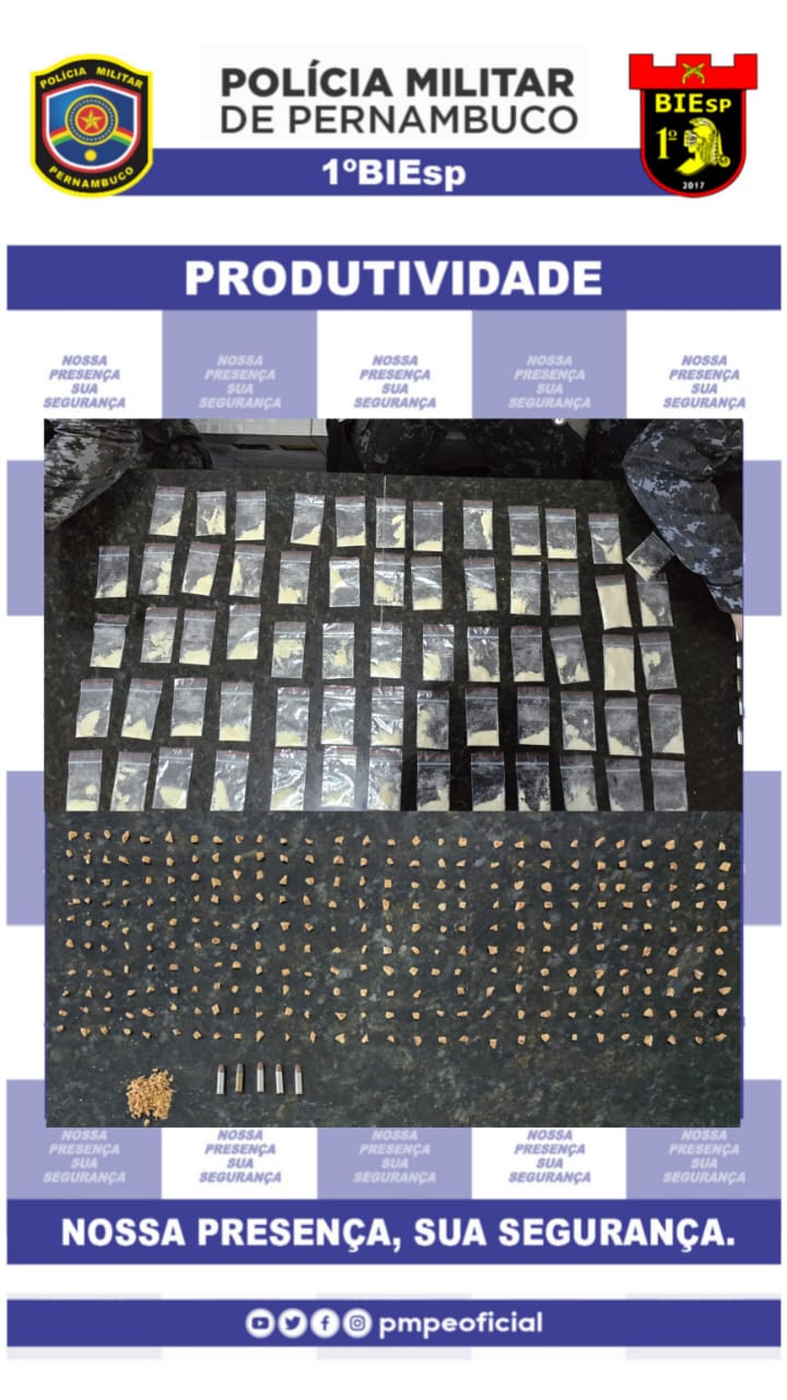 Policiais militares do 1º BIEsp realizaram apreensão de drogas, domingo (10/03), durante abordagens no interior da Companhia de Armazéns Gerais do Estado de Pernambuco (Cajepe), em Caruaru.