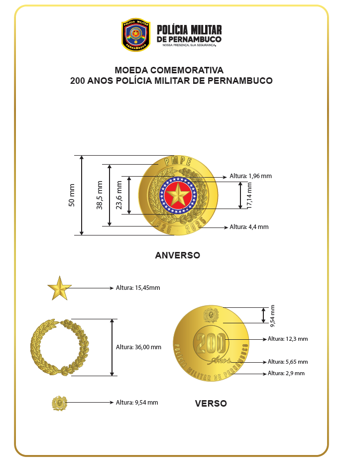 O verso da Moeda em dourado fosco na sua parte central posto o número “200” em alto-relevo polido com 9,0mm de altura e 12mm de largura, abaixo do lado destro do número a palavra “anos” com 4,15mm de altura em alto-relevo polido. Na parte superior central o brasão do Estado de Pernambuco com 07mm de altura e largura proporcional em alto-relevo polido, na margem inferior interna a escrita “Polícia Militar de Pernambuco” com 2,15mm de altura em alto-relevo polido.