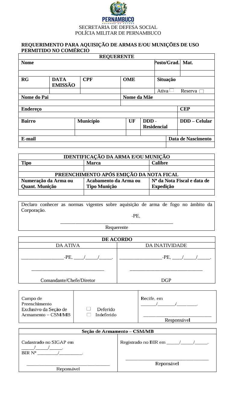 § 2º O militar do Estado, na inatividade, que pretender adquirir arma de fogo e munições, deverá apresentar ao Chefe da DGP-4 requerimento (nos termos do Anexo III) instruído com a apresentação de Certidões Negativas de Antecedentes Criminais, fornecidas pelas Justiças Federal, Estadual, Militar e Eleitoral que comprovem não estar respondendo a crime que desaconselhe a concessão ou manutenção de porte de arma de fogo, que poderão ser fornecidas por meios eletrônicos, anexando cópia autenticada da Cédula de Identidade emitida pelo GI/PMPE.
