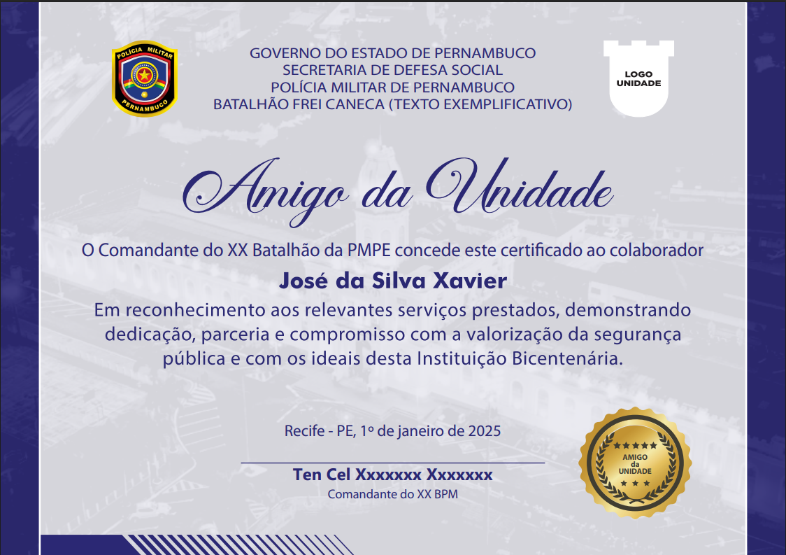Art. 2º Estabelecer que o Certificado será concedido pelos Diretores, Chefes ou Comandantes das Unidades Operacionais e Administrativas da Polícia Militar de Pernambuco.